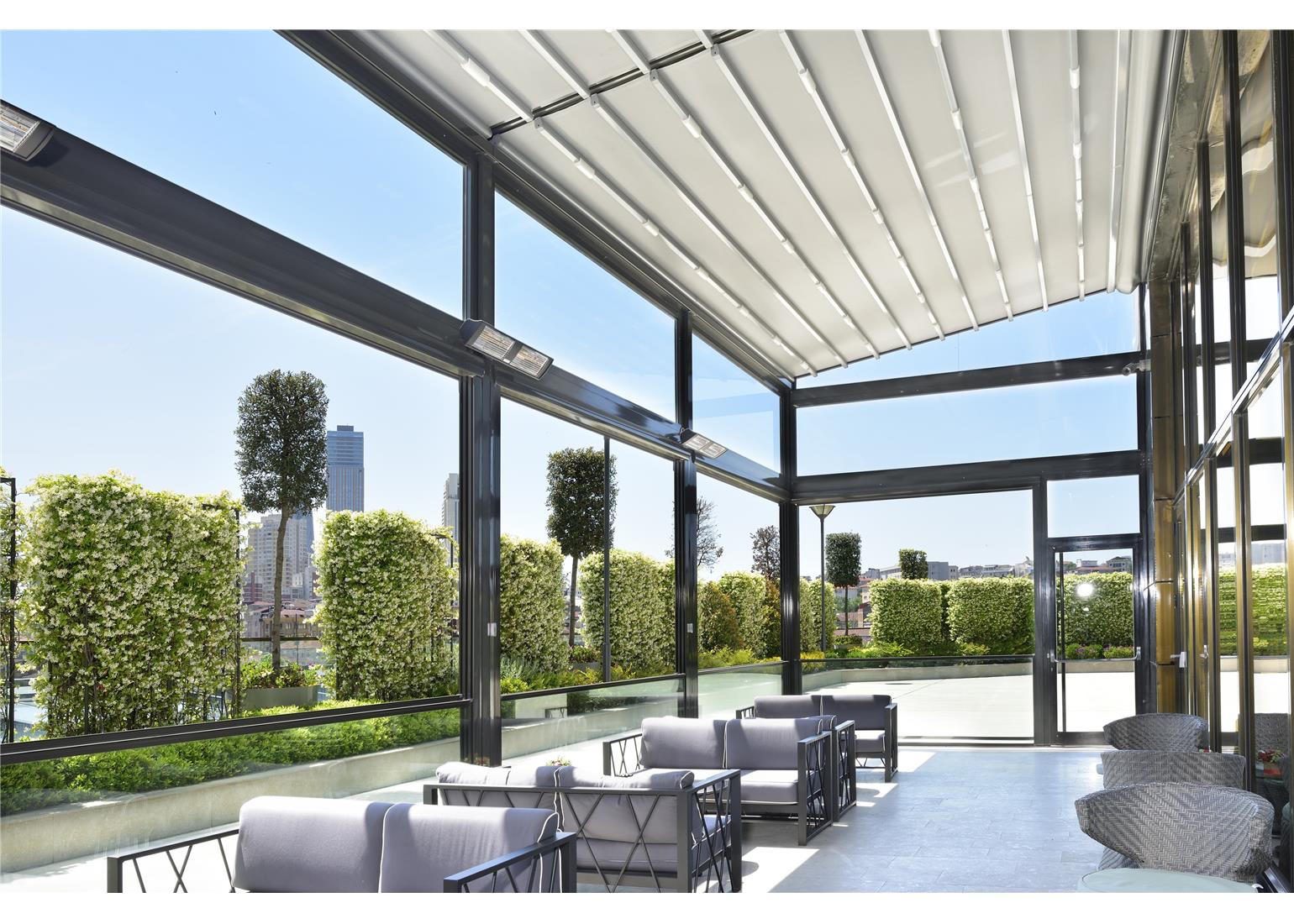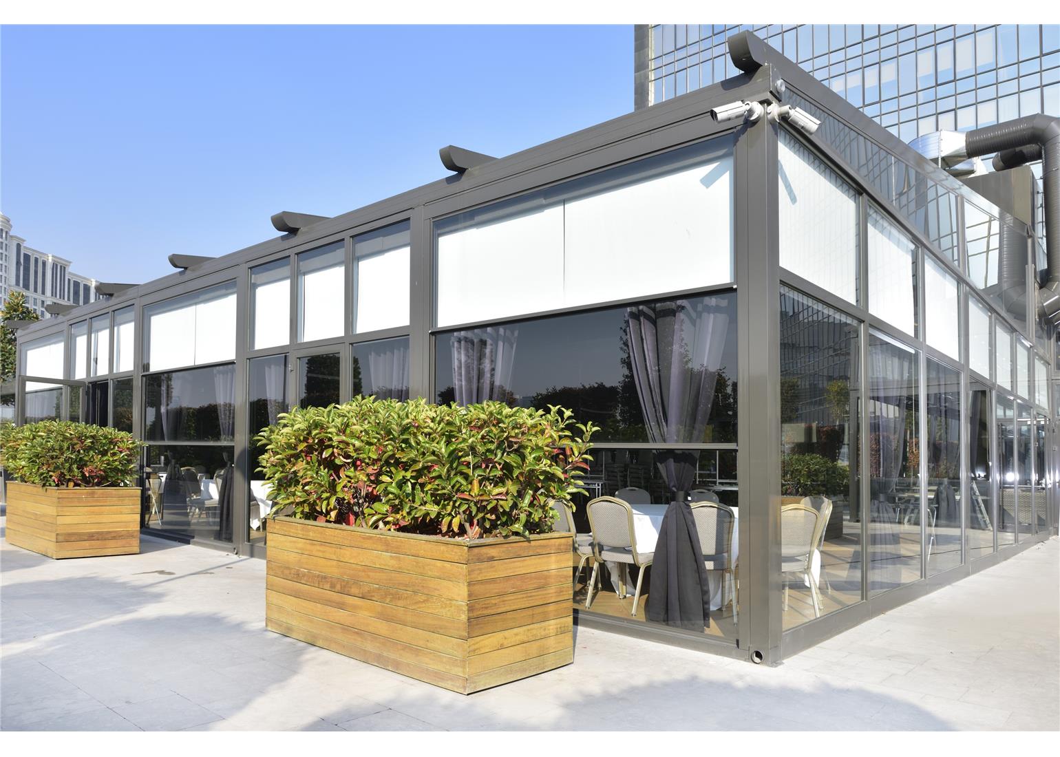 Olympos systems can be used in houses, shops, restaurants, patios, decks, porches, balconies, cafes, patisseries, conservatories, terraces, and hotels.